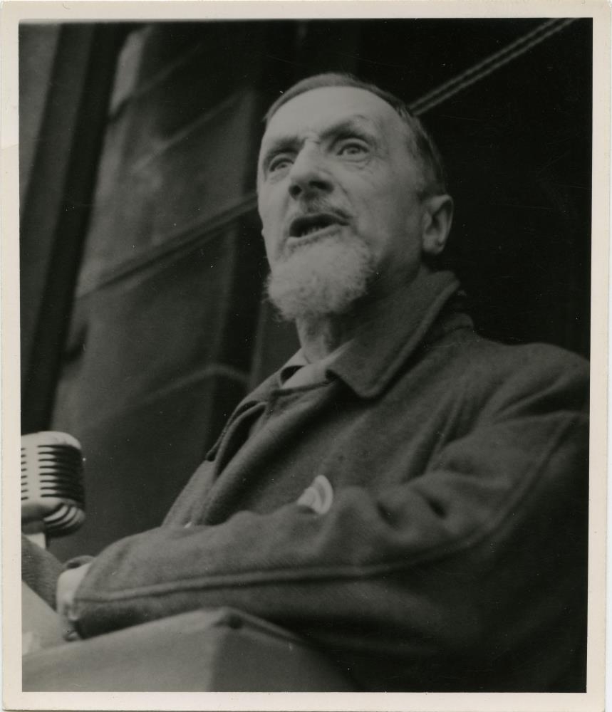 Ólafur Friðriksson verkalýðsforingi flytur ræðu. Tekið við Útvegsbankann 1.maí.