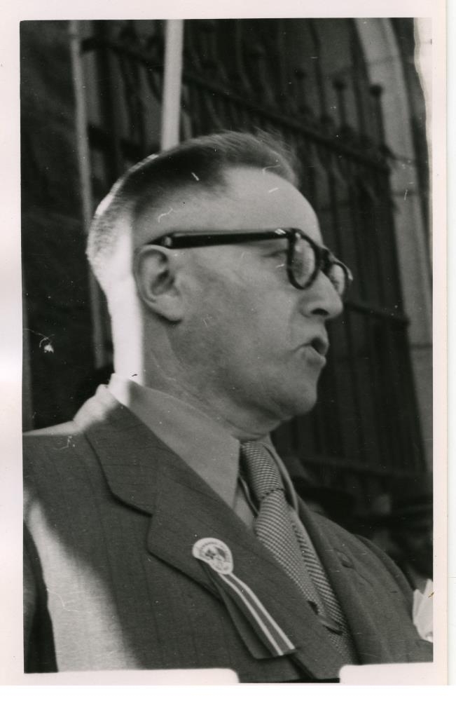 Lækjartorg. Hátíðarhöld 1. maí. Sæmundur Ólafsson frá Sjómannafélagi Reykjavíkur, síðar nefndur Sæmundur í Kexinu. (EL)