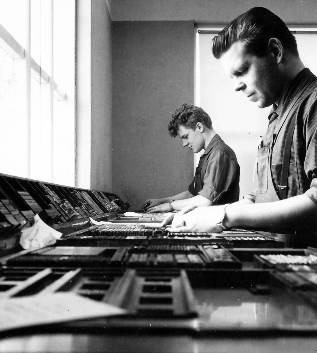 Frímann Frímannsson setjari og Kristján Árnason setjari við handsetningu í setjarasalnum.