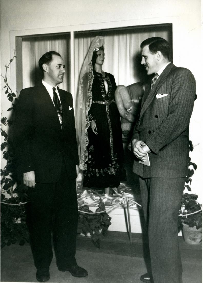 Reykjavíkursýningin 1949. Tveir karlmenn að ræða saman í forgrunni, í bakgrunni sést milli þeirra gína klædd í skautbúning.