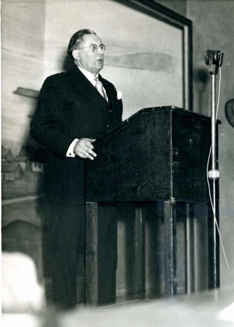 Reykjavíkursýningin 1949. Karlmaður flytur ávarp við sýningaropnunina.