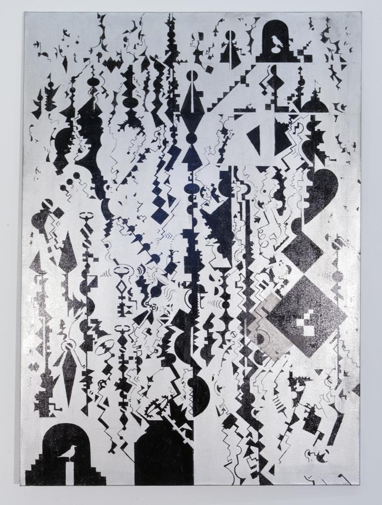 Akrýl málning á striga. Allur bakrunnurinn er silfurlitaður, í forgrunni eru svört geometrísk form. Margskonar í laginu og virðast vera að falla lóðrétt niður. Tveir fuglar greinilegri á myndfletinum, annar neðst en hinn efst.