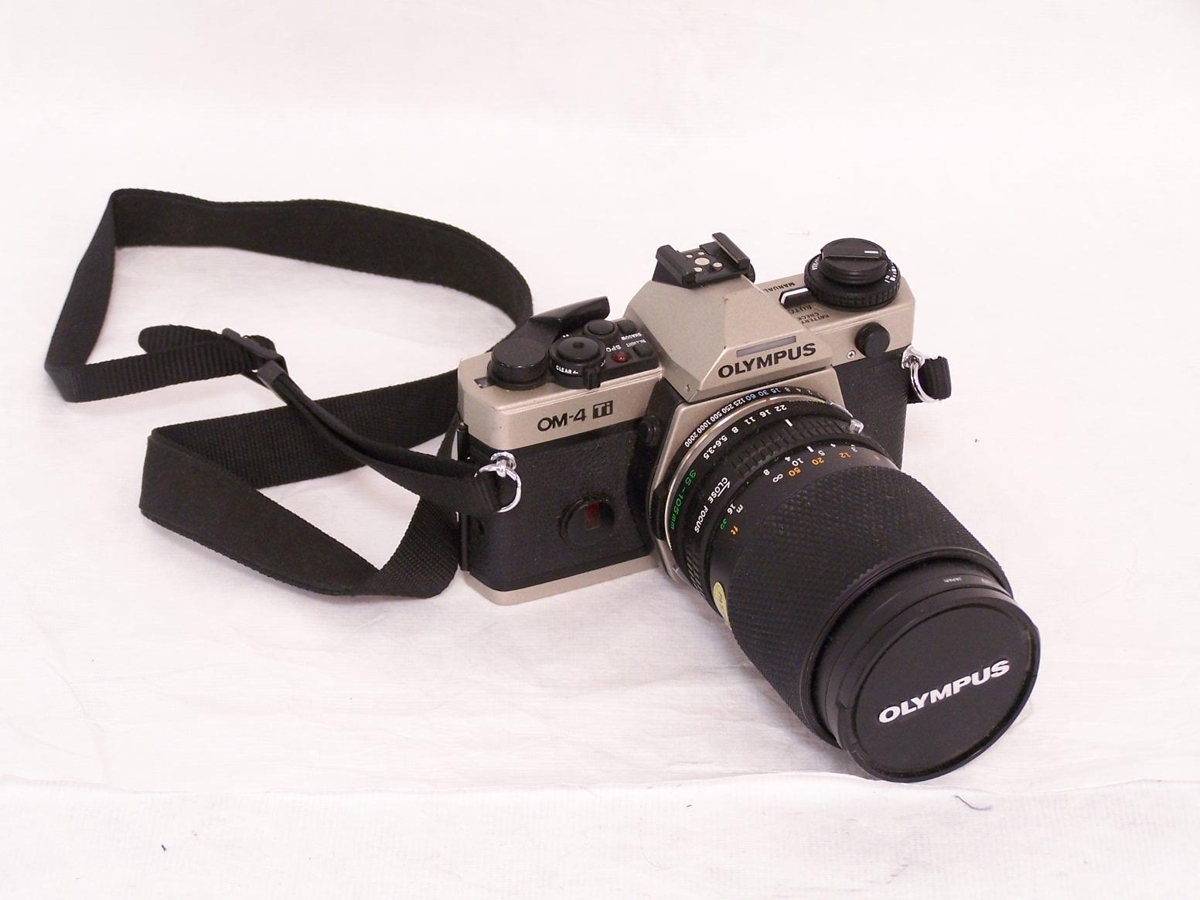 Teg. OM4 Ti. Ljósmyndavél með áfastri Auto Zoom 35-105 mm Osava linsu. Svört. Mál: H. 9 cm 13,5x15 cm. Hlutinn gerði Olympus.
