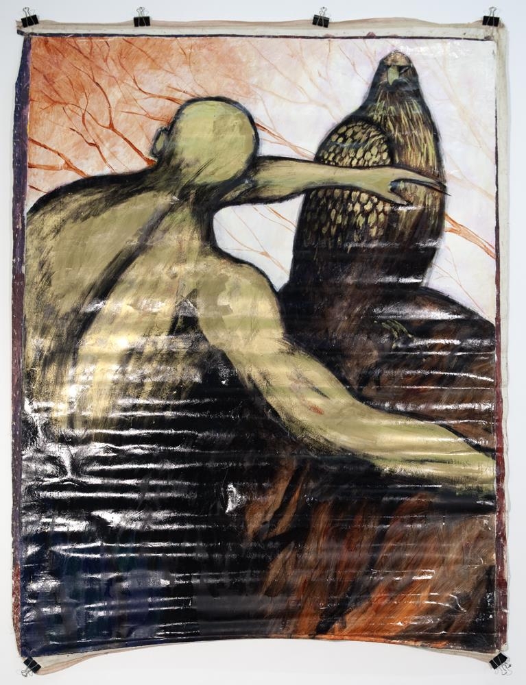 Olíumálverk á striga. Manneskja snýr baki í áhorfanda en í átt að fálka sem er á hól í bakgrunni. Maðurinn hálfpartinn teygir vinstri handlegg í átt að fálkanum, líkt og hann reyni að kasta e-u í hann. Fálkinn snýr til hægri en horfir á manninn. Bakgrunnurinn appelsínugulur og bleikur - línur sem minna á æðar.