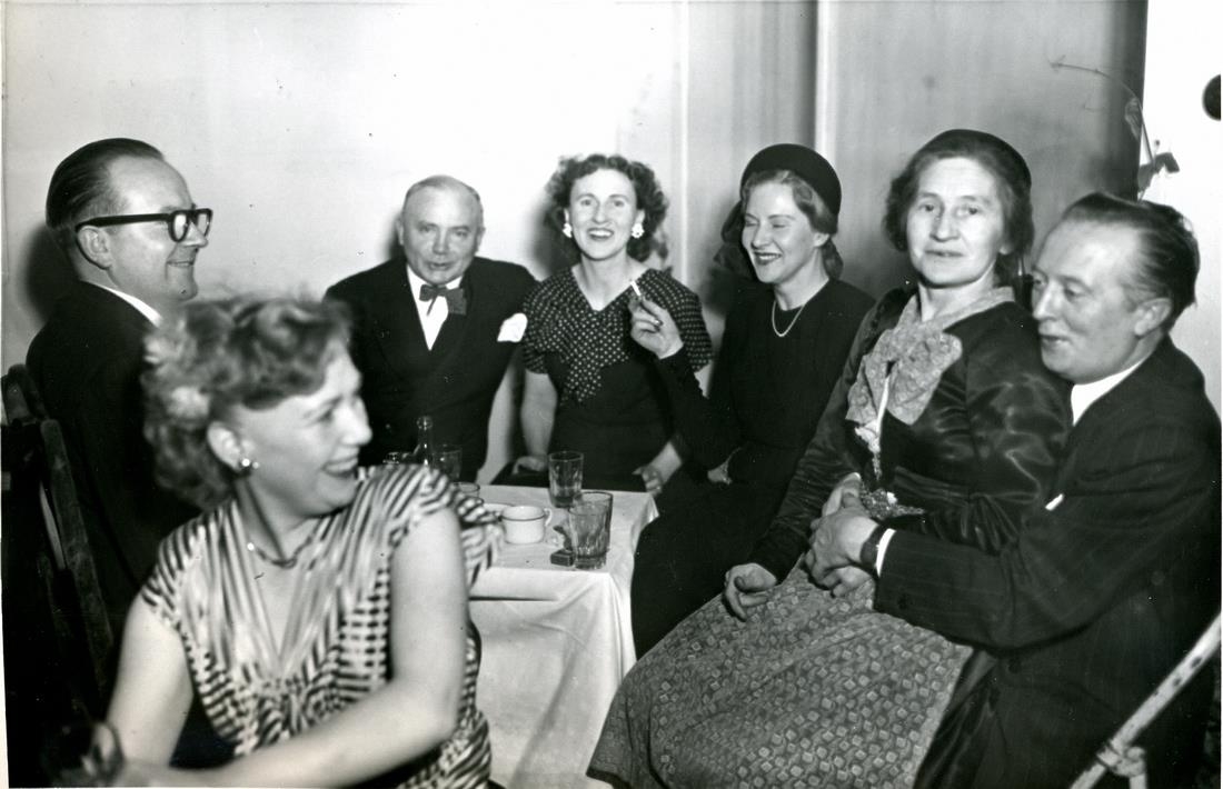 Reykjavíkursýningin 1949. Prúðbúið fólk situr til borðs með ýmsum drykkjarföngum. Glatt á hjalla.