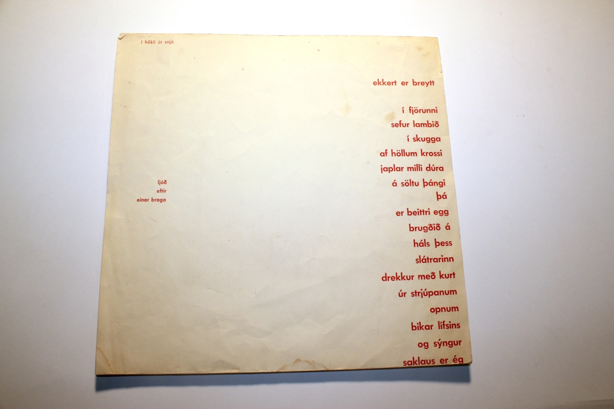 Blað sem er brotið tvisar sinnum, rautt letur á hvítu blaði.