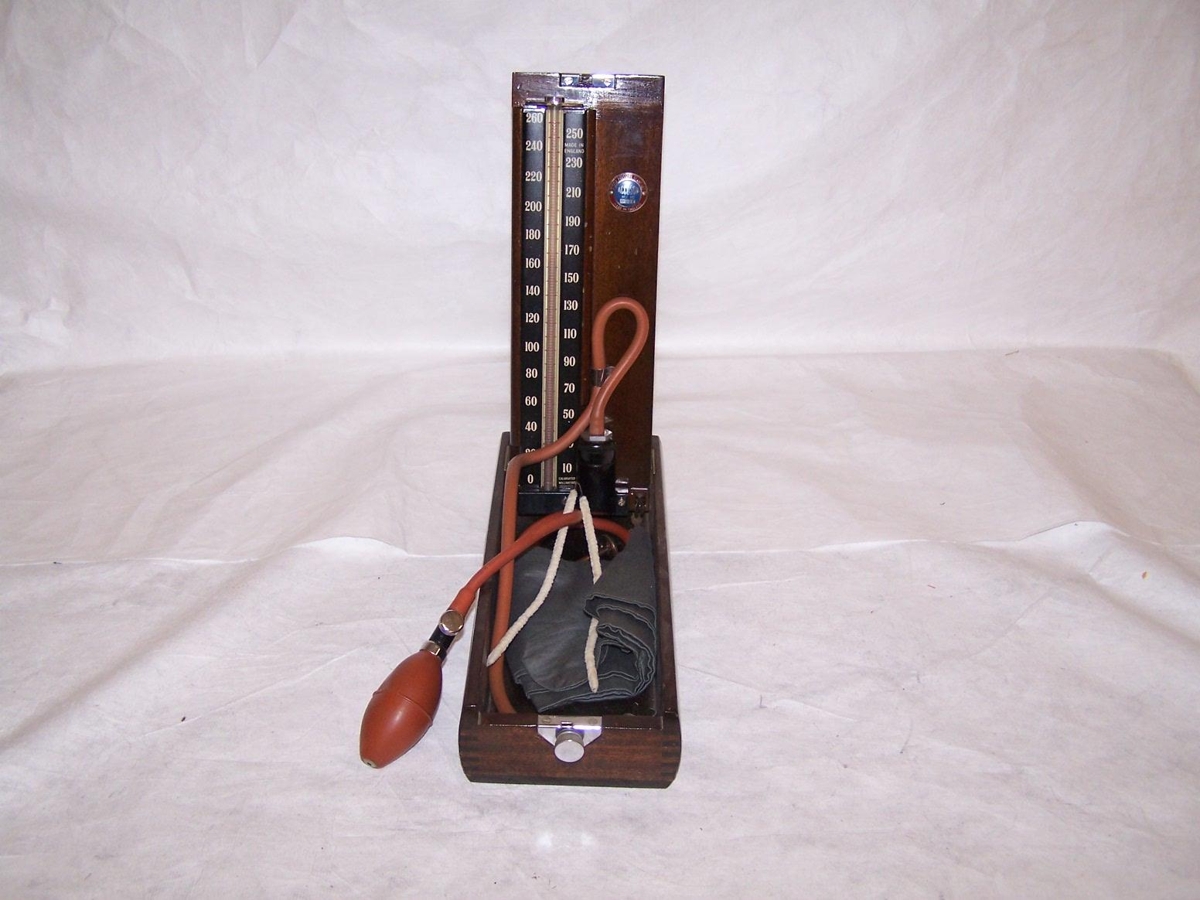 Blóðþrýstingsmælir. í hnotubrúnum viðarkassa, mælirinn er áfastur innan í lokinu.