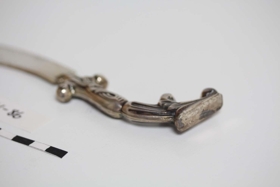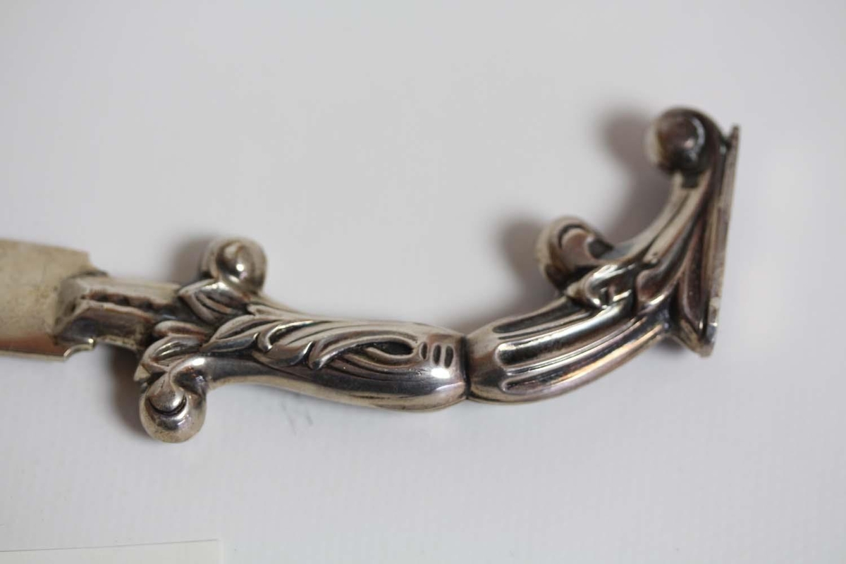 Bréfhnífur, mögulega úr silfri. Handfangið vel skreytt, líkist laufum eða blómum(sjá myndir).
