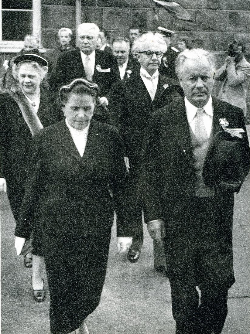 17. júní hátíðarhöldin 1953-1956. Gengið til Dómkirkju, fremst eru Dóra Þórhallsdóttir og Ásgeir Ásgerisson forseti, næst á eftir þeim er Ingibjörg Indriðadóttir Thors og Ólafur Thors forsætisráðherra.