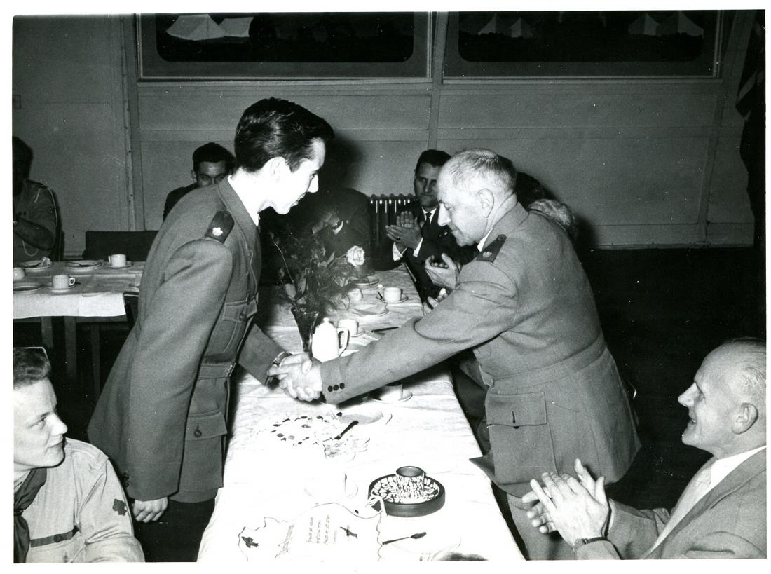 Skátahreyfingin á hátíðarfundi. Tveir fullorðnir skátar takast í hendur yfir fundarborðið.