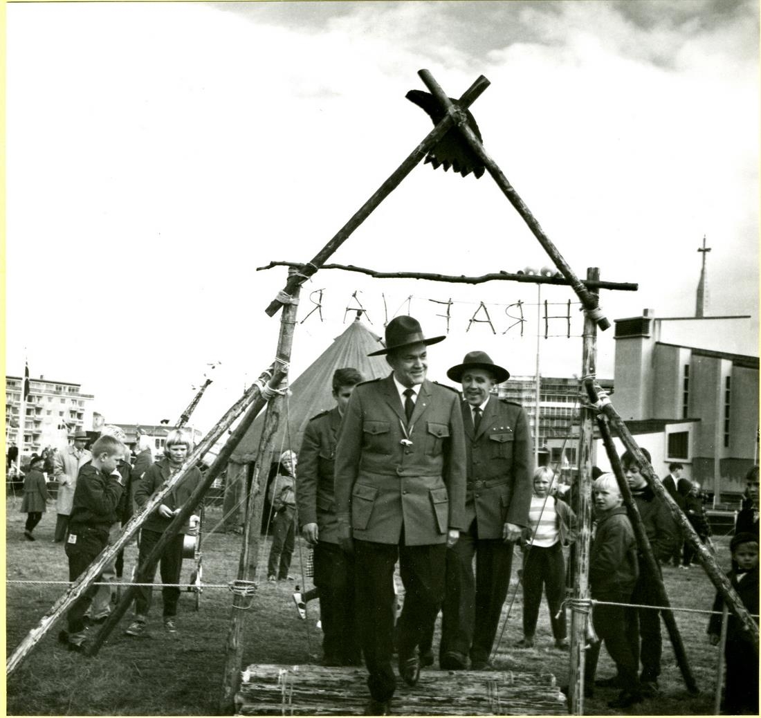 Skátamót á Hagatorgi. Hlið, gert úr grönnum trjávið. Efst er nafnið HRAFNAR búið til úr greinum og strekkt milli hliðstólpanna. Skátahöfðingjar skoða smíðina og ganga í gagnum hliðið. Áhorfendur fylgjast með, samkomutjald, Neskirkja og Hótel Saga í bakgrunni