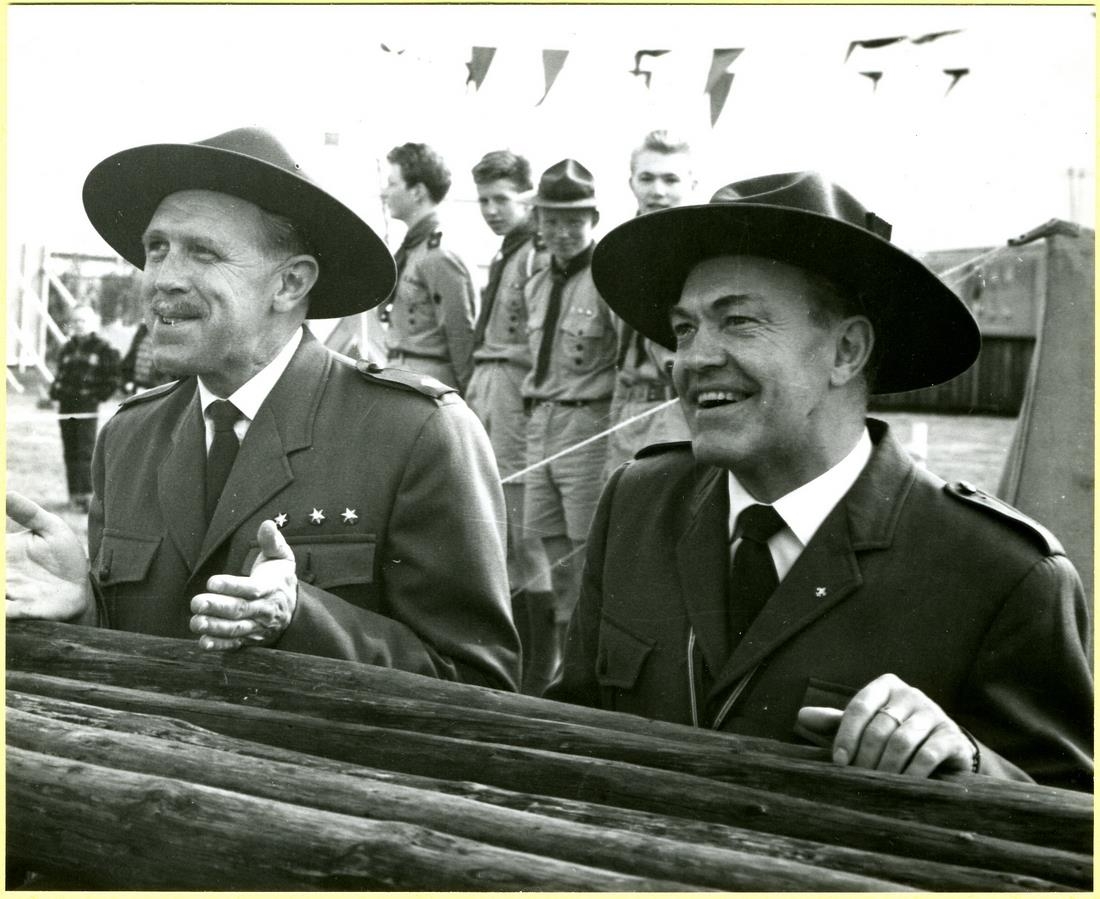 „Jónas B Jónsson skátahöfðingi og fræðslutstjóri til hægri á myndinni.“ (RJ 2019)