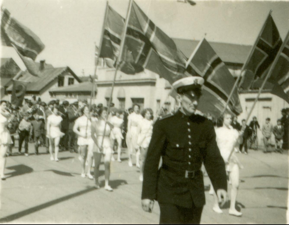 Fánaberar og lögregluþjónn í forgrunni. Fimleikafélag Hafnarfjarðar. Myndin er tekin á Strandgötu í Hafnarfirði húsið til vinstri með tveimur risgluggum er Súfistinn, Strandgata 9 Hafnarfirði.