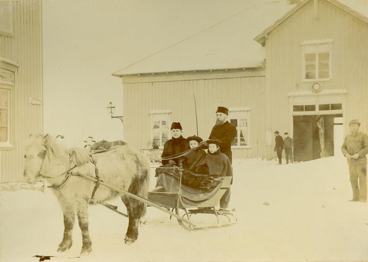 Guðbrandur Finnbogason, eiginkona og dætur á hestasleða fyrir framan Aðalstræti 2 og Vesturgötu 2 í Reykjavík.
