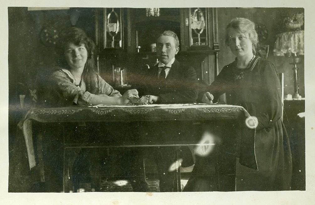 Aðalsteinn Kristinsson situr við borðstofuborð með óþekktar konur á hvora hönd.