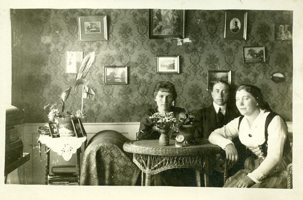 Tvær konur og einn karlmaður sitja saman í stofu. Lára Pálmadóttir lengst til hægri, Aðalsteinn Kristinsson maður hennar henni við hlið og lengst til vinstri óþekkt kona. Myndir hanga á veggjum bak við þau.