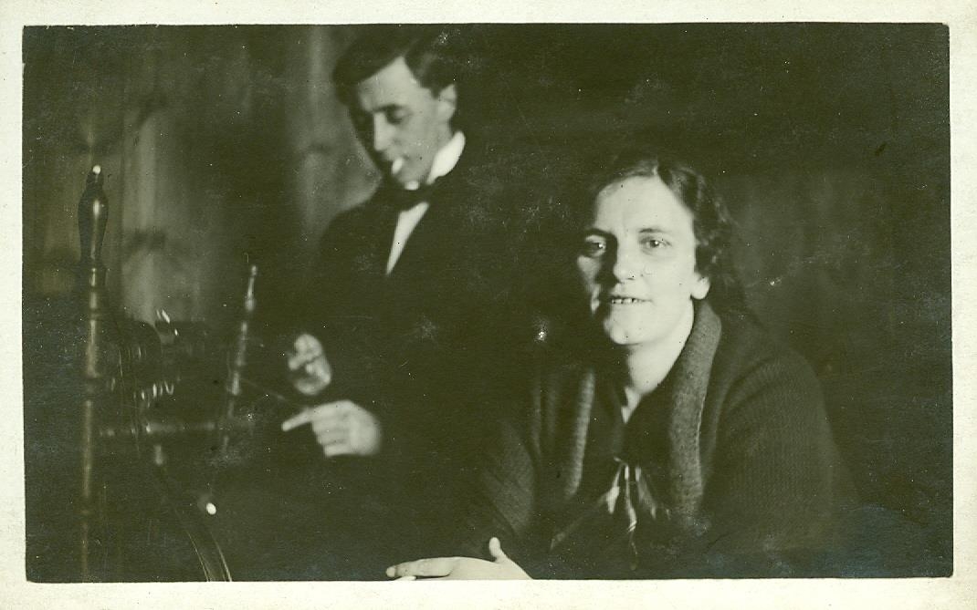 Líklega hjónin Aðalsteinn Kristinsson og Lára Pálmadóttir. Lára í forgrunni myndarinnar og horfir fram. Aðalsteinn sést aftar með sígarettu í munni fyrir framan rokk.