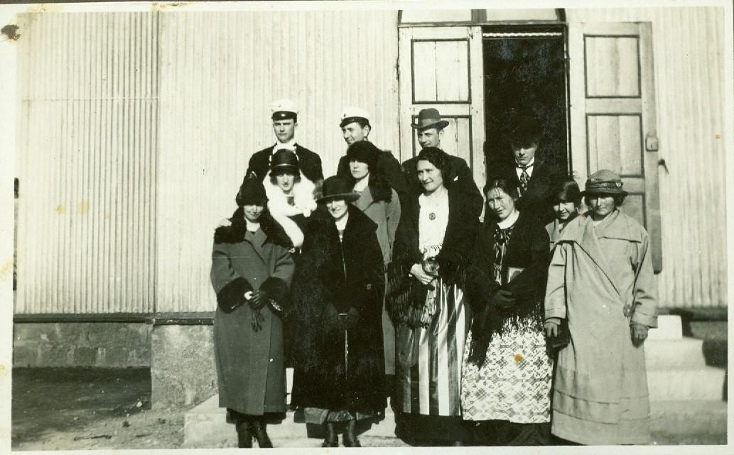 12 manneskjur standa saman á tröppum við hús. Tveir nýstúdentar eru í hópnum. Annar þeirra, efst til vinstri á myndinni, er Þormóður Sigurðsson frá Ystafelli.