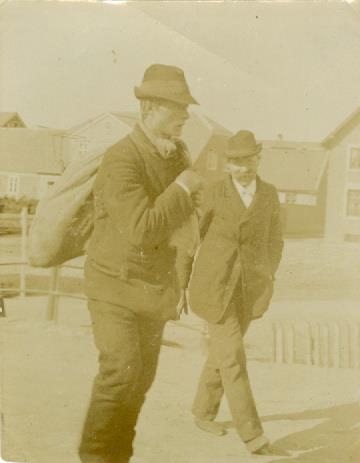 Tveir karlmenn á gangi á Lækjartorgi, annar með poka um öxl, hin að veita honum athyggli. Aftan á myndinni stendur: "Þjófur úr Árnessýslu sem strauk til Reykjavíkur um aldamótin. Símon á Fossi er að handtaka hann. Í baksýn sést m.a. í Melsteðshús.