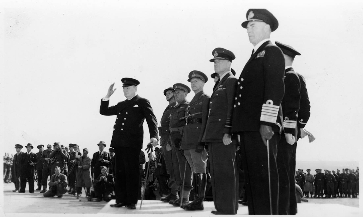Winston Churchill í heimsókn á Íslandi 1941. Hann stendur fremstur, fyrir aftan hann standa einkennisklæddir hermenn og mannfjöldi sést bakvið þá.