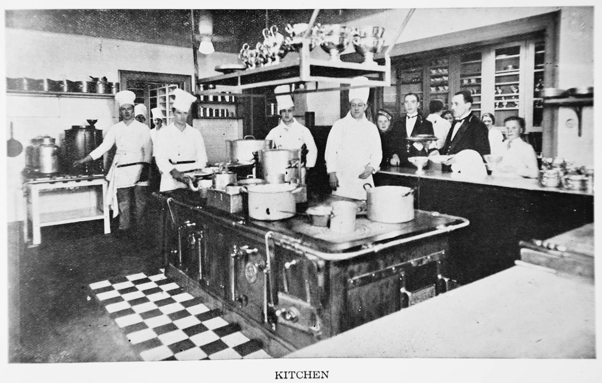 Horft yfir eldhúsið á Hótel Borg. Kokkar, þjónar og annað starfsfólk saman komið.