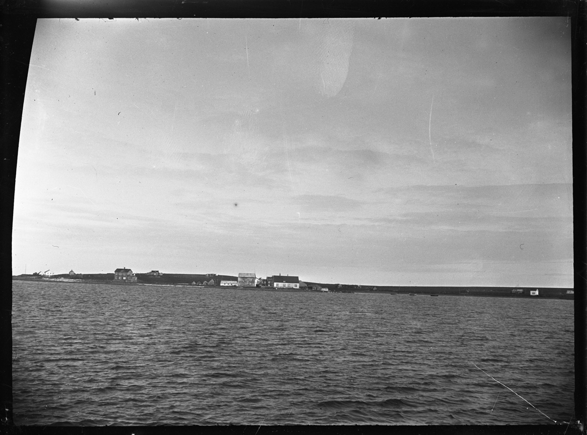 Þéttbýli við sjó með einni húsaþyrpingu og nokkrum stökum húsum út frá henni. Framan við aðalhúsaþyrpingu er bryggja. Bátar á legu. Fiskur breiddur út til þurrkunar í fjöru. Verslunarhúsin mynda kjarna byggðar. Húsin eru bæði torfhús og timburhús. Tekið af skipi útifyrir.