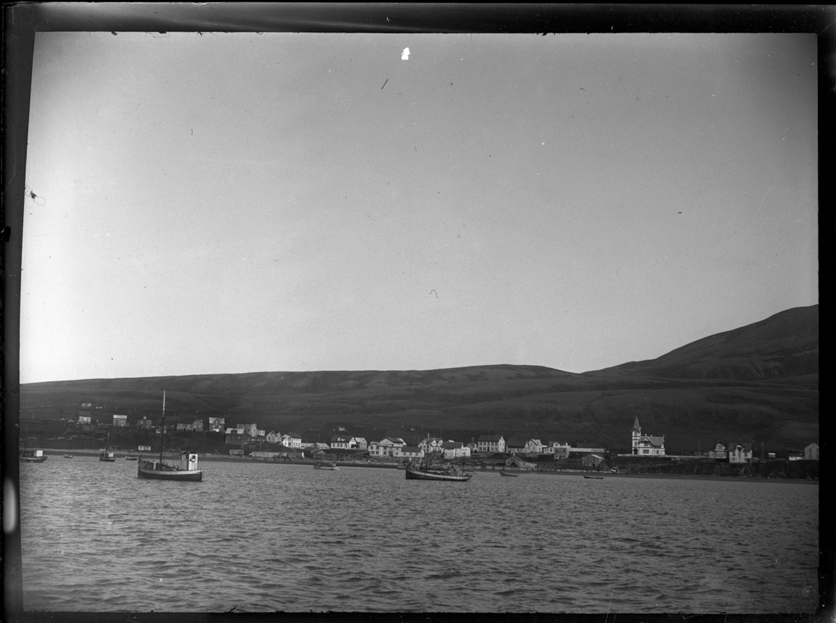 Þéttbýli við sjó. Þétt byggð timburhúsa með kirkju. Yfirbyggðir vélbátar á legu uti fyrir. Fjall í bakgrunni. Tekið af skipi útifyrir.
