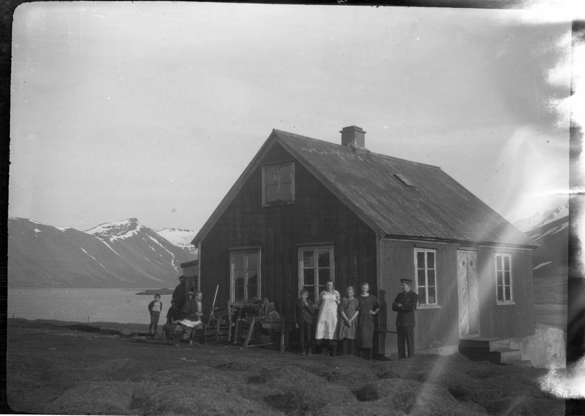 Sveitarbær við sjó. Sér út á fjörð og til fjalla. Íbúðarhús sem er timburhús með stórum sex rúðu gluggum og bárujárnsklæddu þaki á steyptum kjallara eða grunni. Fólk við húsgafl og þar eru laupar, hverfisteinn og fleira dót.