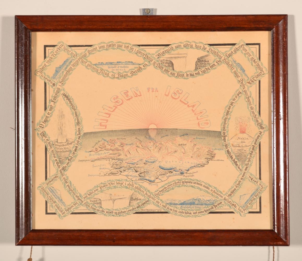 Innrömmuð prentmynd. Texti „Hilsen fra Island“