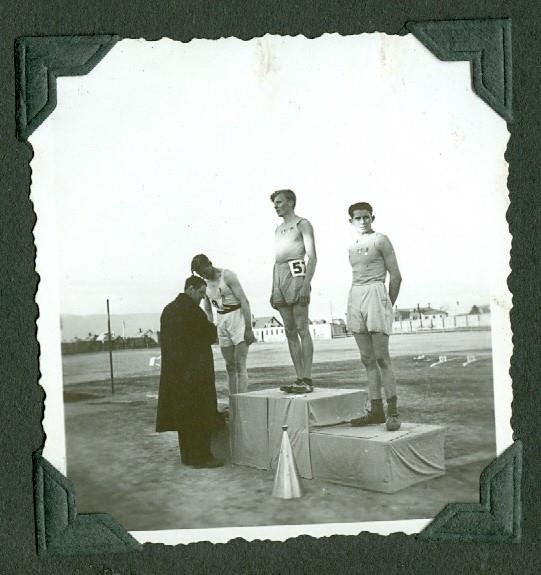 Þrír menn á verðlaunapalli og sá fjórði að veita þeim verðlaun. Líklega Erlendur Ó. Pétursson að veita verðaluninni og Baldur Möller lengst til hægri á myndinni.