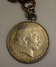 Einnar eða tveggja krónu silfurpeningur frá 1915, bakhliðin verið slípuð upp og árituð.