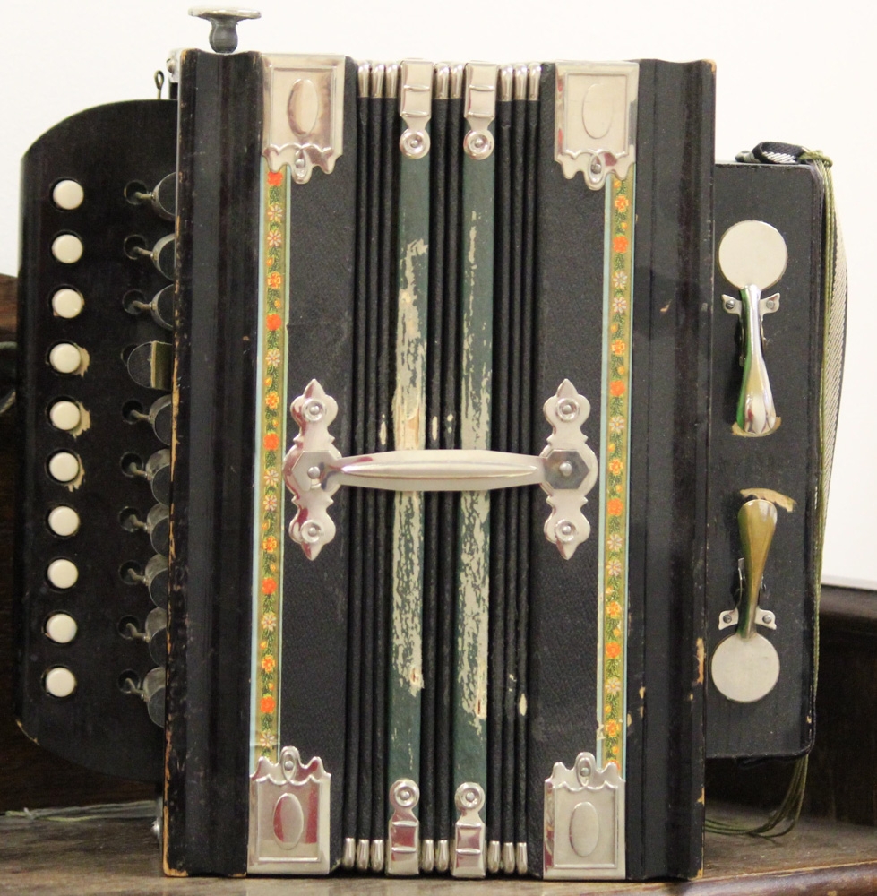 Harmonika Ásgerðar Þorvarðardóttur (1894-1993) frá Leikskálum, Haukadal, Dalasýslu. Ásgerður eignaðist harmonikuna á unglingsárum, það er á fyrsta áratug síðustu aldar.