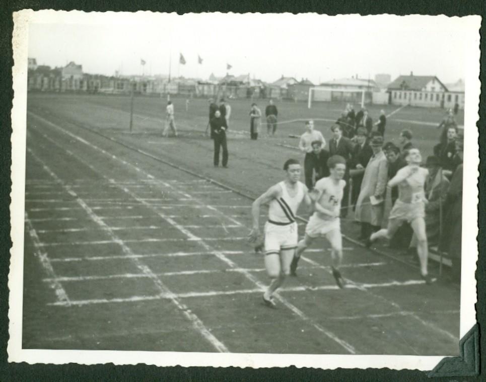 Karlmenn að hlaupa á hlaupabraut á Melavellinum. Brynjólfur Ingólfsson lengst til vinstri.