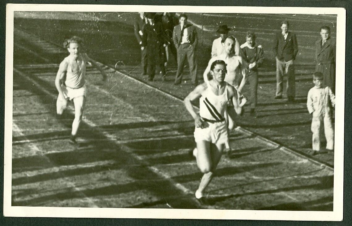 Karlmenn að hlaupa á hlaupabraut á Melavellinum. Brynjólfur Ingólfsson fremstur.