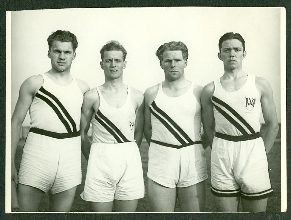 Fjórir menn í íþróttabúningum merktur KR standa saman. Lengst til vinstri er Jóhann Bernhard, þriðji frá vinstri er Gunnar Huseby og sá fjórði frá vinstri Brynjólfur Ingólfsson.