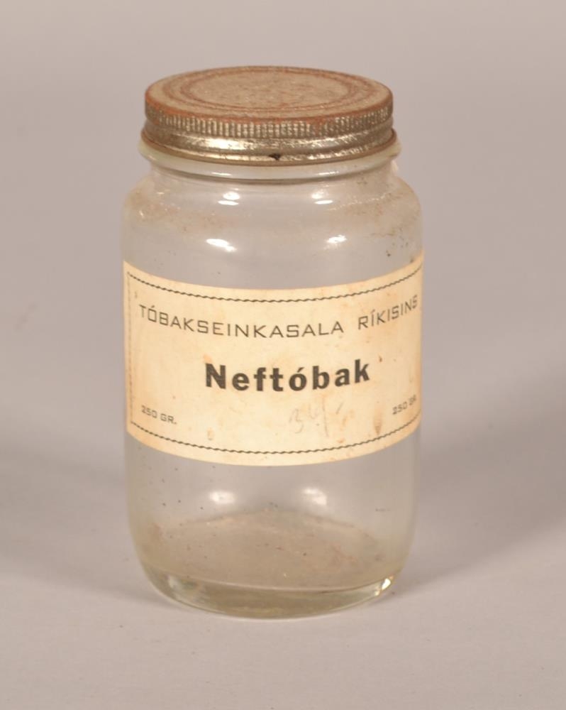 Krukka úr glæru gleri með málmloki, undan neftóbaki. Merkt „Tóbakseinkasala ríkisins. Neftóbak“