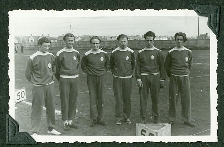 Sex karlmenn standa saman í íþróttabúningum á Melavellinum. Magnús E. Baldvinsson lengst til vinstri, næstur Kjartan R. Jóhannsson, fjórði frá vinstri er Ingólfur Steinsson og sá fimmti frá vinstri Jóel Sigurðsson.