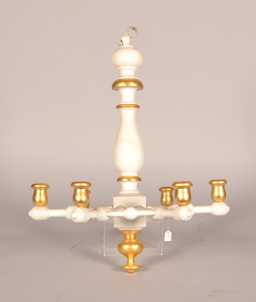 Hvítur og gylltur sexarma kertastjaki úr tré, til að hengja í loft