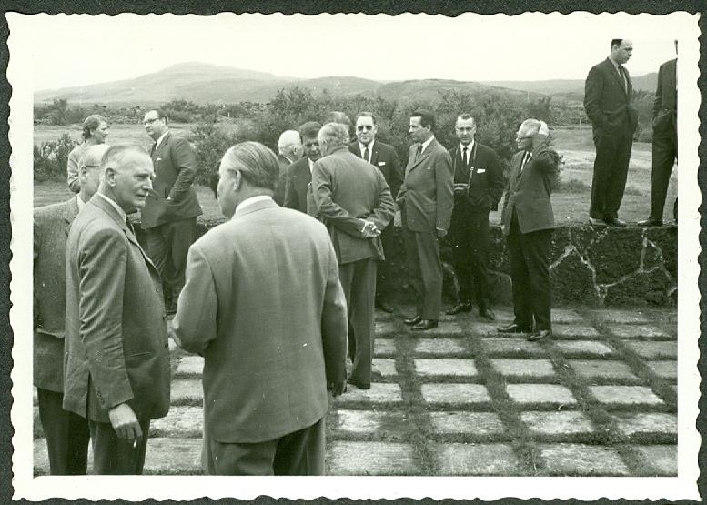 Fólk saman komið við Bifröst, væntanlega erlendir gestir. Pétur Benediktsson, Sigurður Óli Ólafsson og Sigurjón Sigurðsson sjást lengst til hægri á myndinni.