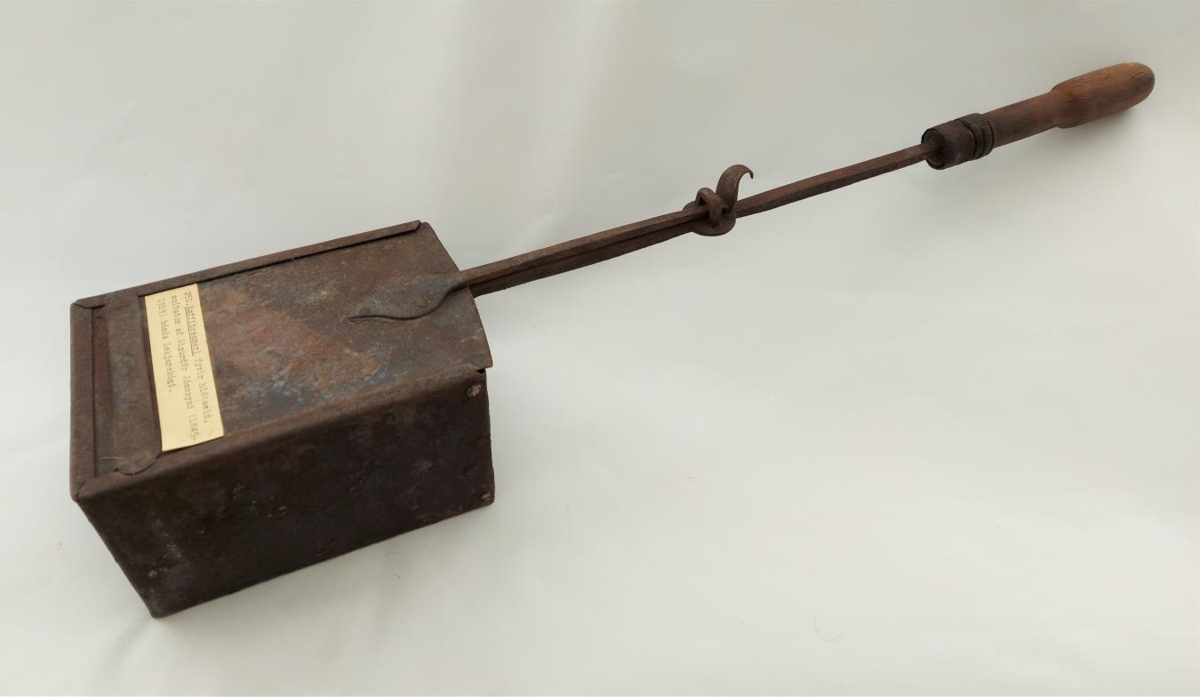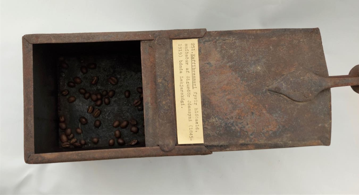 Kaffibrennari fyrir hlóðaeld, smíðaður af Sigurdör Jónssyni í Lækjarskógi.