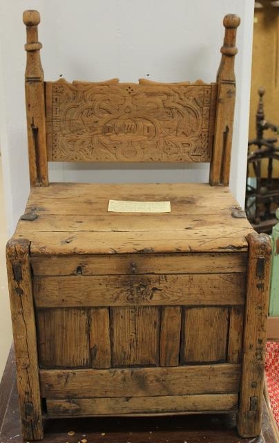 (Hefur upphaflega verið armstóll). Með útskorinni bakfjöl og þar á ártalið 1745 og fangamark OMD.