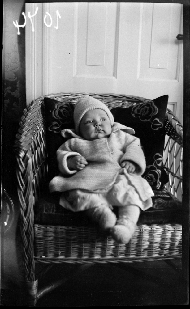 Barn í prjónaðri kápu með húfu situr á útsaumuðum púða í körfustól.