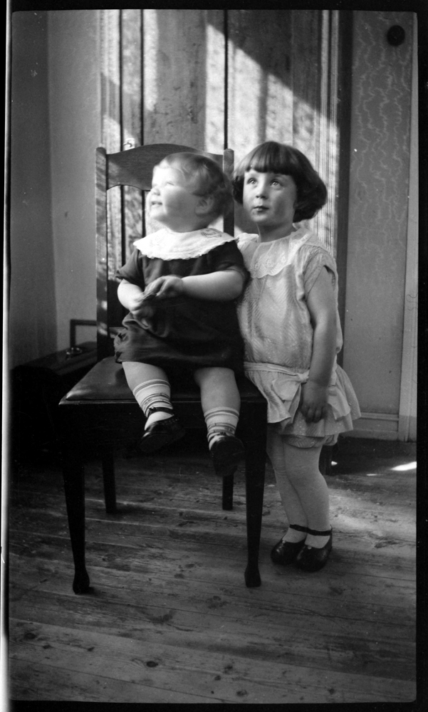 Tvær litlar stelpur í kjölum með lausum blúndukrögum við stól, önnur situr en hin stendur. Þetta eru Helga Gestsdóttir og Elínborg Reynisdóttir.