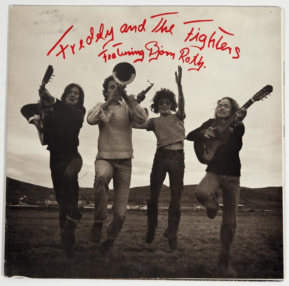 Vínylplata. Svarthvít ljósmynd. Handskrifaður texti í rauðu.