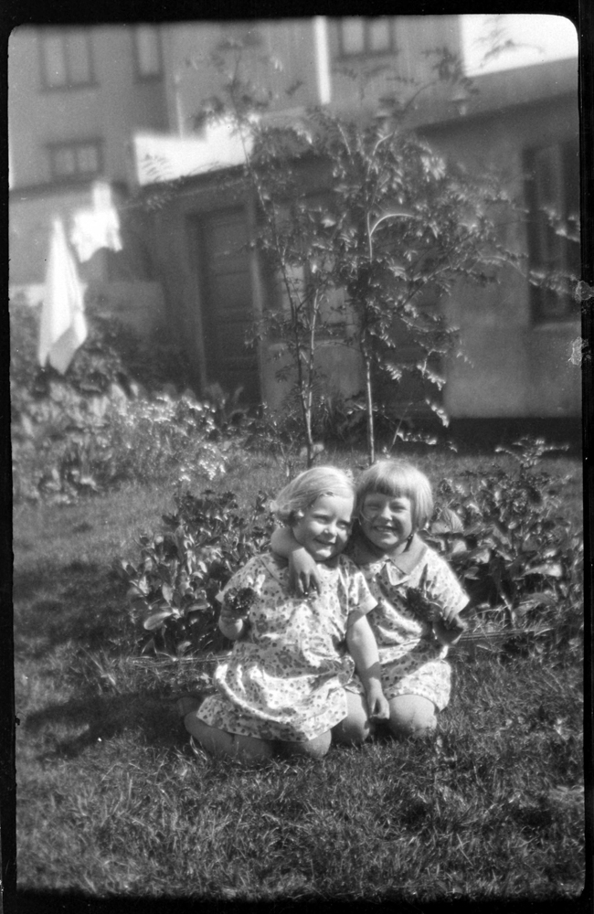 Tvær stelpur stija við hríslu í beði útí garði. Skúr á baklóðinni.