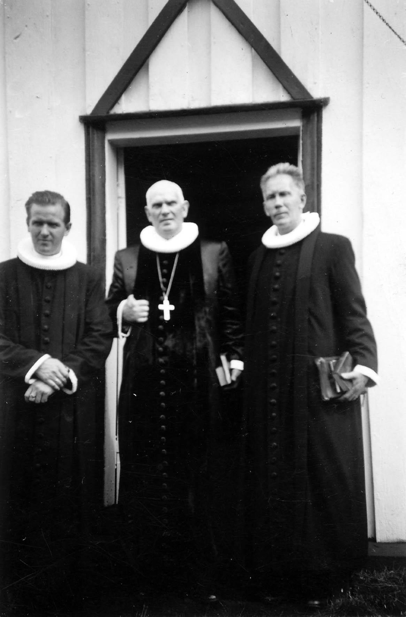 Fyrir framan við kirkjuna: séra Pétur Sigurgeirsson, séra Sigurgeir Sigurðsson biskup, séra Benjamín Kristjánsson sóknarprestur