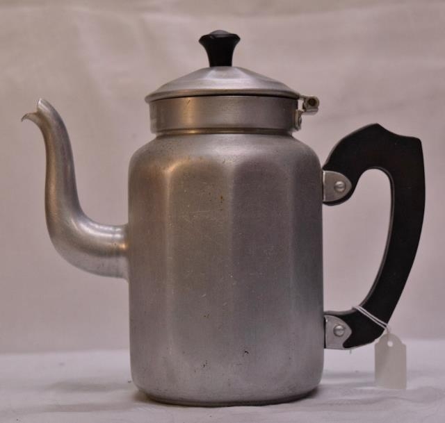 Nett kaffikanna með svörtu haldi og svörtum tappa í loki. Úr búi Margrétar Jóhannsdóttur ljósmóður á Neðri-Brunná.