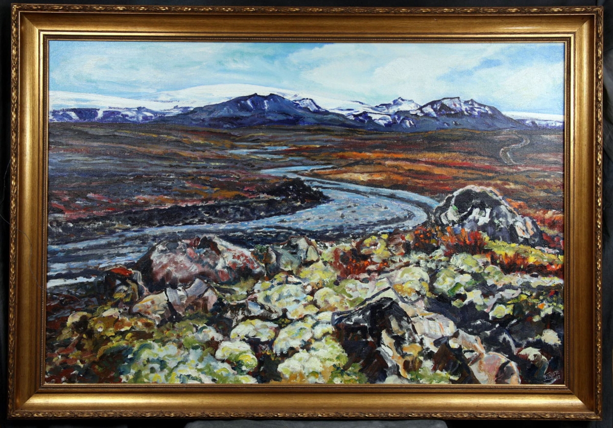 Málverk eftir Einar Ingimundarson (1929 - 1997). Myndin er máluð ofarlega í Húsafellslandi og sýnir landslagið í nágrenni Kaldadals, tignarlega jökla og fjöll.