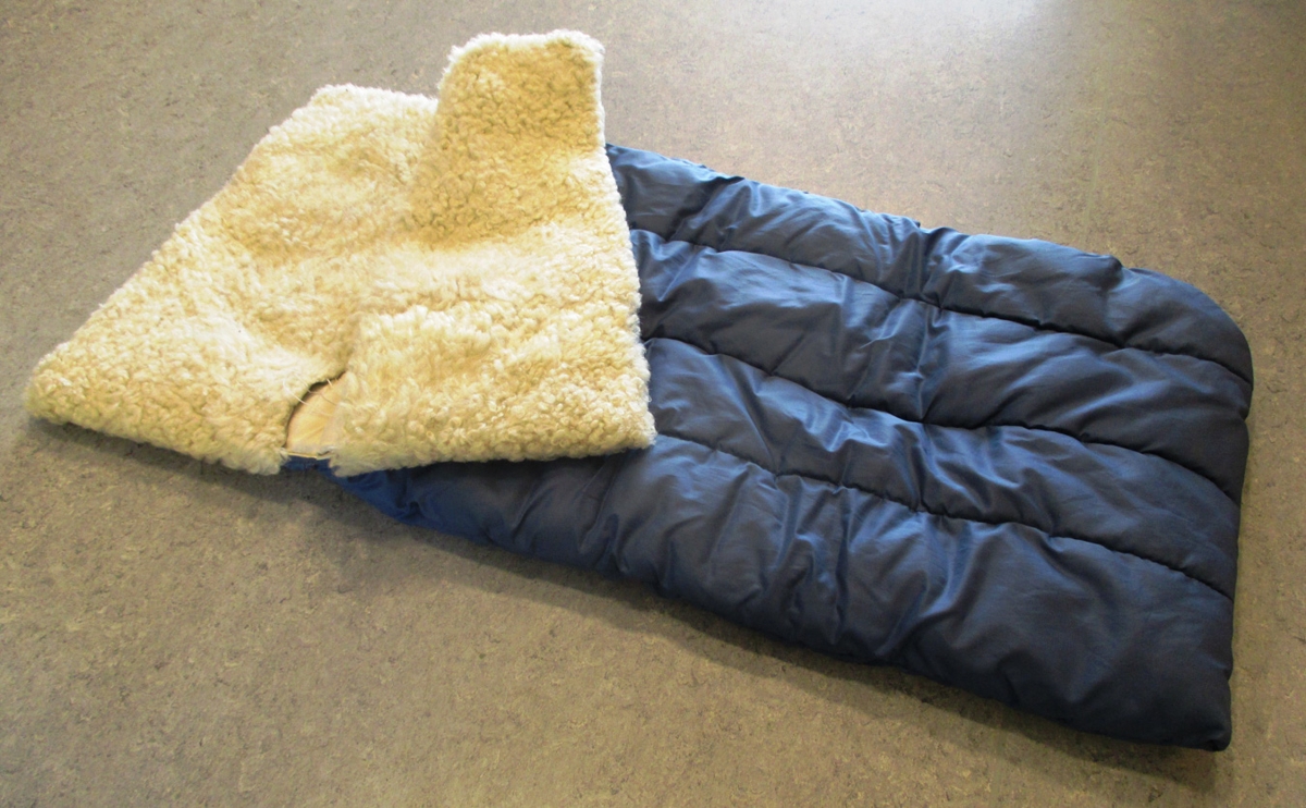 Gærupoki fyrir börn til þess að sofa í úti í vagni. Pokinn er blár en gæran innan í pokanum er hvít. Pokinn er 84 sm að lengd og 41 sm að breidd. Pokinn er u.þ.b. 70 ára gamall þegar hann berst safninu.