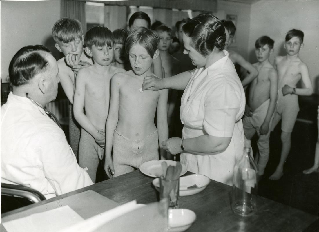 Læknisskoðun í barnaskóla. Hópur drengja bíður í röð eftir skoðun hjá lækni, hjúkrunarkona leggur plástur á bringu þess fremsta, líklega berklaplástur.